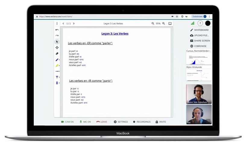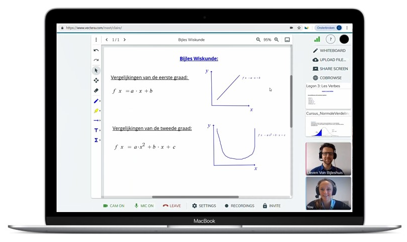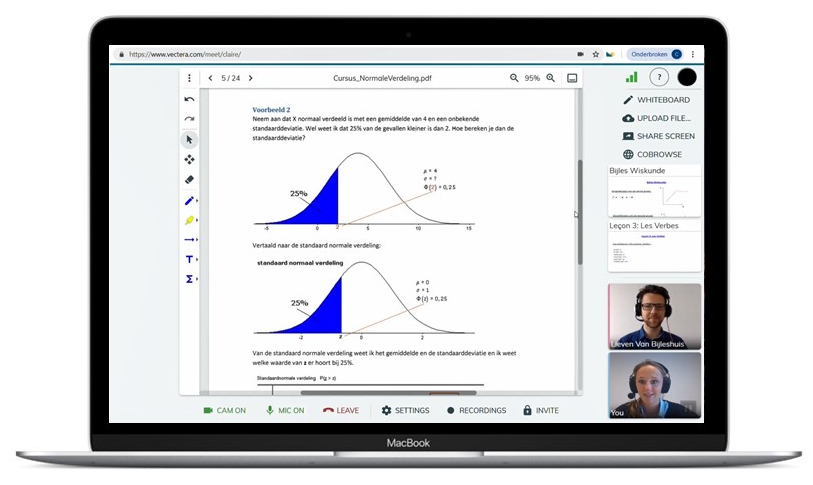 Deel je scherm met je bijlesgever, cobrowse met z’n tweetjes door websites, upload je lesstof en maak samen oefeningen en notities! Bovendien zie en hoor je jouw lesgever live via de videochat en maak je gebruik van een interactief digitaal schoolbord.