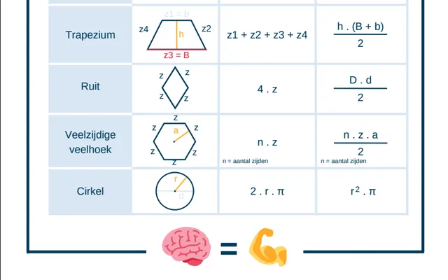 Een handig schema met de courante figuren en hoe je hun omtrek en oppervlakte berekent