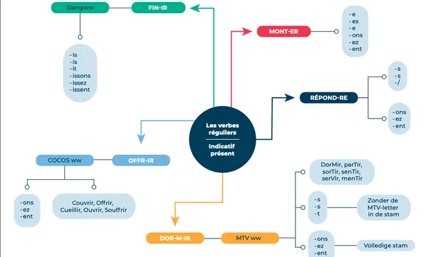 Een handig overzicht met de vorming van alle regelmatige werkwoorden in de indicatif présent