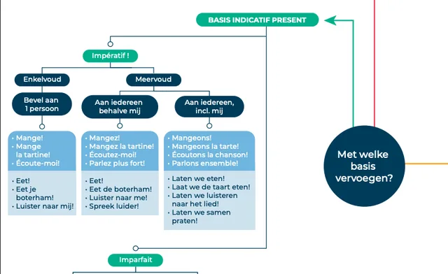 Mindmap met overzicht van de vorming van de belangrijkste vervoegingen in het Frans